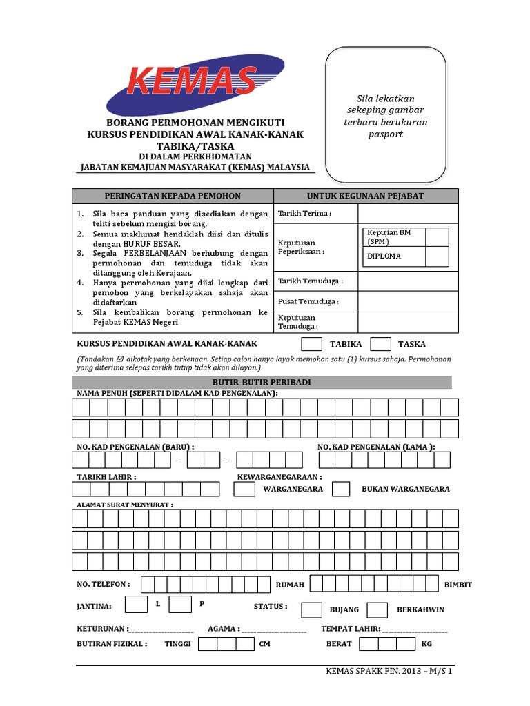 Borang Permohonan Jawatan Guru Tabika Taska Kemas 2020