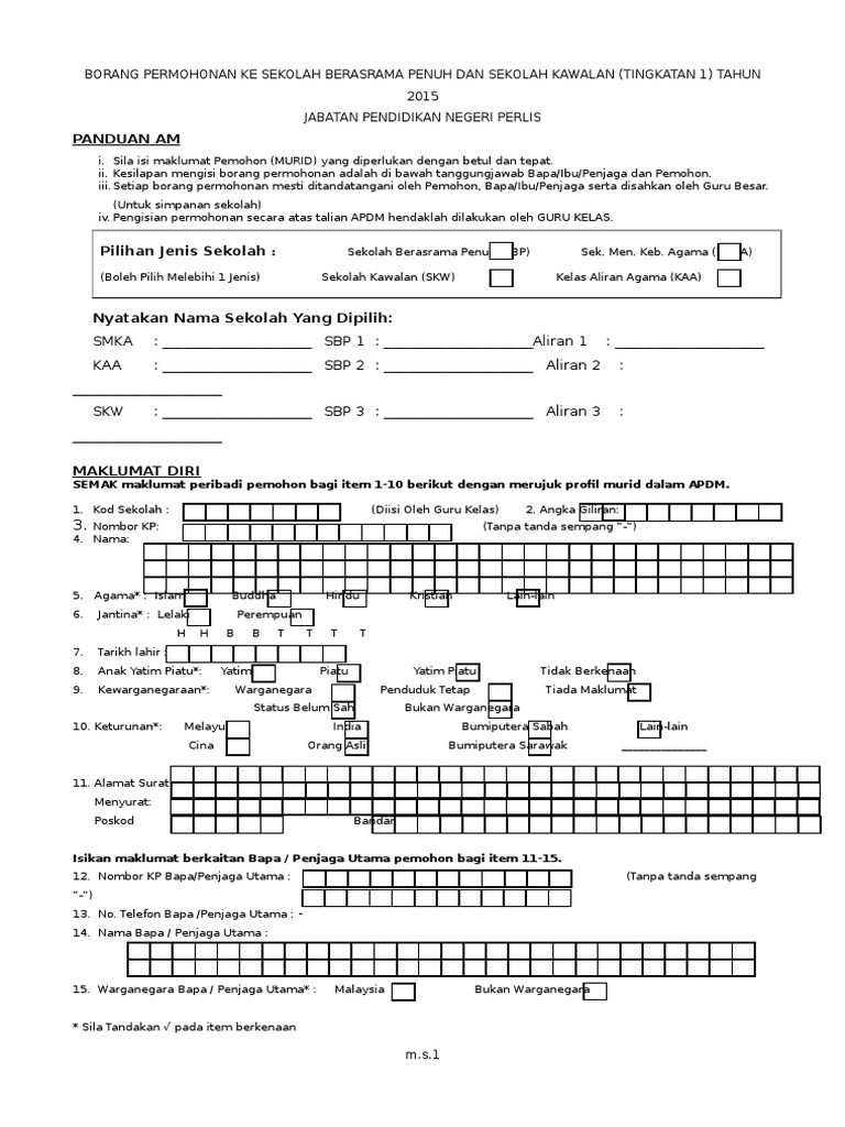 Borang Permohonan Sekolah Asrama Penuh Dan Kawalan Tahun 2015
