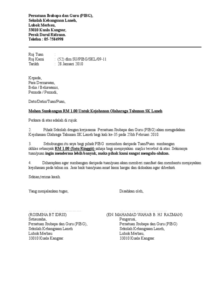 Contoh Surat Rasmi Memohon Sumbangan Pibg Surat Rasmi A