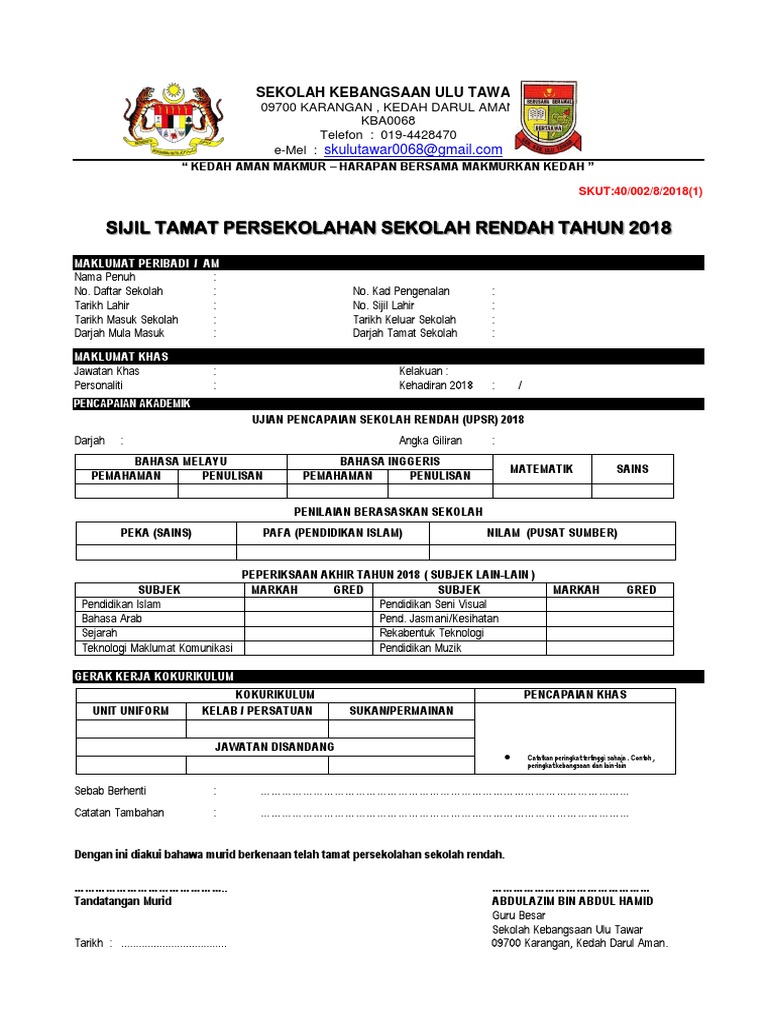 Sijil Tamat Persekolahan Sekolah Rendah Skut Docx