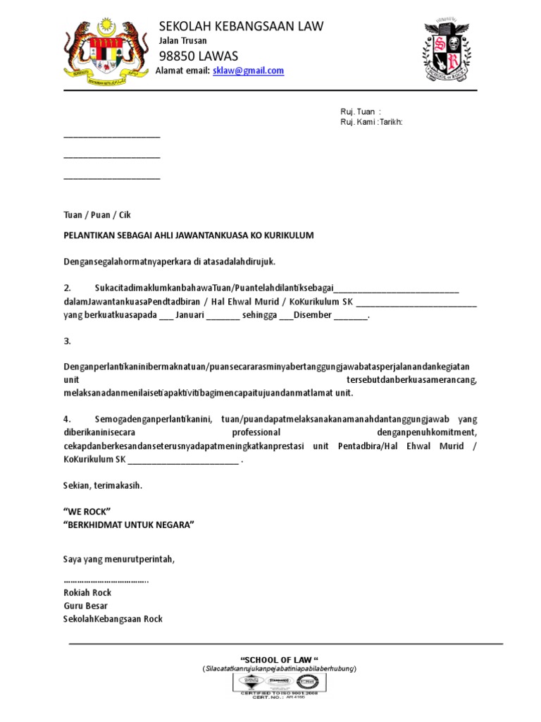 Contoh Surat Lantikan Ajk Ko Kurikulum