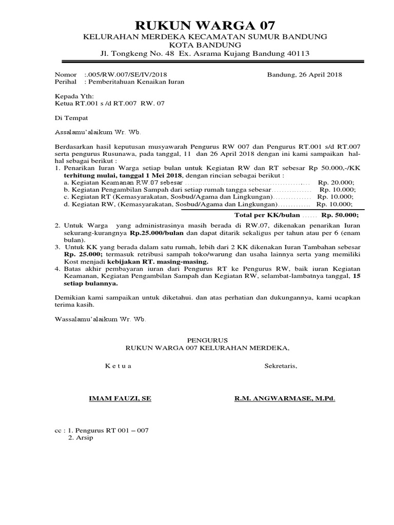 Contoh Surat Edaran Kenaikan Iuran Bulanan Rt Dapatkan Contoh