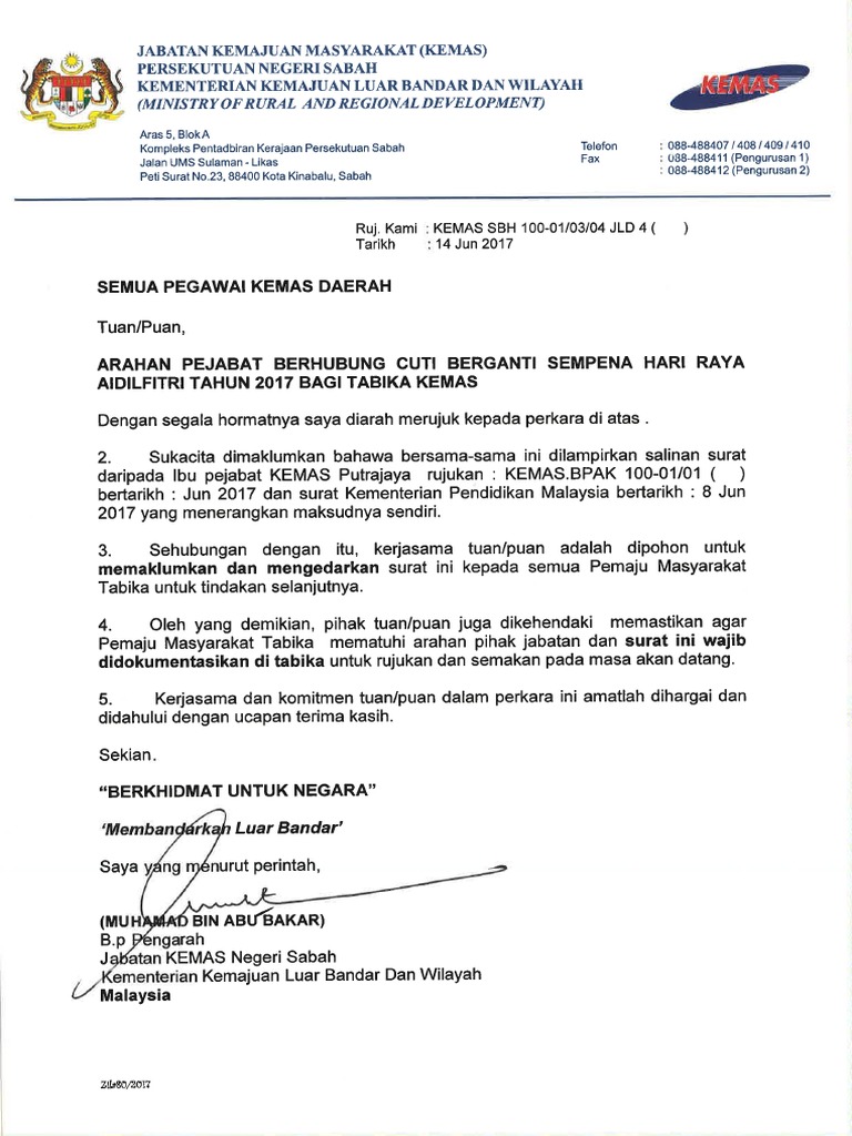 Arahan Pejabat Berhubung Cuti Berganti Sempena Hari Raya Aidilfitri Tahun 2017 Bagi Tabika Kemas